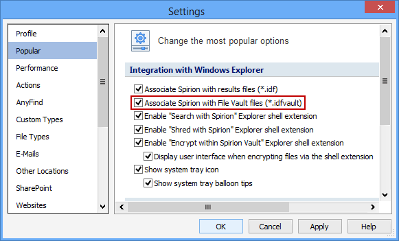 The Associate Spirion with File Vault Files (*.idfvault) setting enables Windows Explorer to recognize *.idfvault files as Spirion results. When enabled, you may double-click *.idfvault files in Windows Explorer and have them automatically prompt for a password to decrypt them. This will also display a Spirion results file icon for *.idfvault files in Windows Explorer.