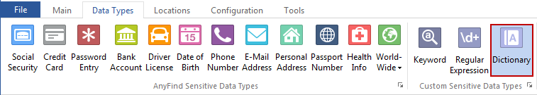 Spirion can search for words within Dictionaries. You can enable or disable searching for Dictionaries by clicking the Data Types ribbon, then the Dictionary button. If you have not configured what to search for yet, the Custom Types List will be displayed and allow you to enter the full path to one or more dictionary files. After you enter the path to a dictionary and click OK, searching for Dictionaries will be enabled. When the ribbon button is highlighted, Spirion will search for Dictionaries. To edit what to search for, click the option button. You may search for other Data Types simultaneously.
