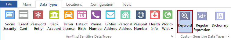 Spirion can search for Keywords. You can enable or disable searching for Keywords by clicking the Data Types ribbon, then the Keyword button. If you have not configured what to search for yet, the Custom Types List will be displayed and allow you to enter the desired Keywords. After you add keywords and click OK, searching for Keywords will be enabled. When the ribbon button is highlighted, Spirion will search for Keywords. To edit what to search for, click the option button. You may search for other Data Types simultaneously.