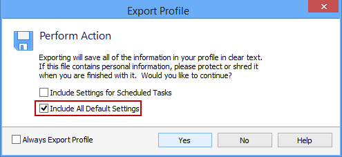 Select the Include All Default Settings option and all of the default settings in the application will be included in the exported profile in addition to any settings that you have specifically configured. If this option is not selected only the settings that have been specifically configured will be included. This option is enabled by default.