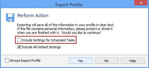 Select the Include Settings for Scheduled Tasks option to include any Scheduled Tasks in the exported profile that you have configured to run on the endpoint. This setting is disabled by default.
