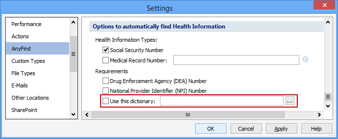 A Health Information results is either an SSN or an MRN (specified as a regular expression). In order to consider that SSN or MRN as a result, additional validation can be optionally required. The Use this dictionary setting requires that the location contain words within the dictionary that you specify for the location to be considered a match. Selection of SSN or MRN is required for this setting to have any effect.