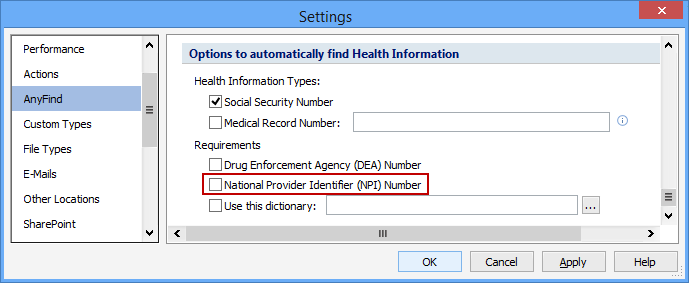 A Health Information results is either an SSN or an MRN (specified as a regular expression). In order to consider that SSN or MRN as a result, additional validation can be optionally required. The National Provider Identifier (NPI) Number setting requires that the location contain a properly formatted NPI number for the location to be considered a match. Selection of SSN or MRN is required for this setting to have any effect.