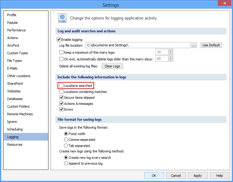 When you enable logging, you have the ability to log Locations Searched. Locations Searched are each location on your computer that Spirion has searched, regardless of whether or not it contained a match.