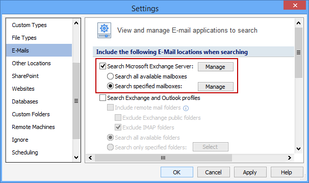To search Exchange Servers, click the emails button's dropdown menu, then select Customize email Settings. The View and Manage email Applications to Search dialog will appear: