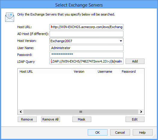 Next to, Search Microsoft Exchange Server, click the Manage button. Note: If Search Microsoft Exchange Server is not displayed then the license does not include the Exchange Search Module. The Select Exchange Servers dialog will be displayed to provide the following settings to configure the Microsoft Exchange Server connection.