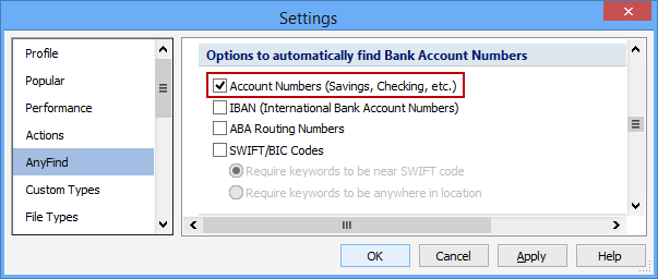 The Account Numbers (Savings, Checking, etc.) setting allows you to specify whether Spirion will search for general format numeric bank account numbers when searching for bank account numbers with AnyFind. This setting is equivalent to enabling Bank Account AnyFind prior to version 7.0 of the agent software. When this setting is enabled and IBAN (International Bank Account Numbers), ABA Routing Numbers and SWIFT/BIC Codes are disabled, Bank Account AnyFind will function identically to version 6 and earlier.