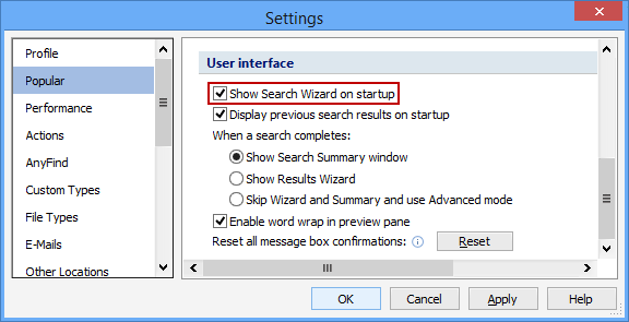 Enabling the Show Search Wizard on Startup setting will cause Spirion to open with the Search Wizard each time you run the program. If you decide you do not want to use the wizard, uncheck this box. If you previously disabled the Search Wizard and now want it to open each time you run Spirion, you must check this box.