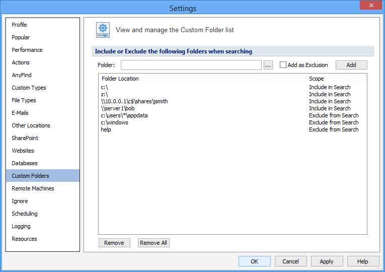 You may also add a bare folder name in the custom folder list as an exclusion. Whenever that folder name is encountered, it will be skipped as if the full path were in the list. For example, if you add help as an exclusion, the folders c:\help, c:\windows\help, d:\customapp\documentation\help and all of the folders beneath those folders will not be searched. Bare folder names can only be used as an exclusion and cannot be used to specify folders to include in the search.