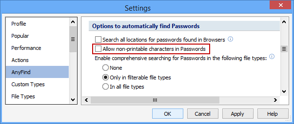 The Allow Non-Printable Characters in Passwords setting allows you to specify whether Spirion will search for passwords that contain non-printable characters that are within the ASCII range 0 to 31. When AnyFind Passwords is enabled, Spirion will search all locations you specify for passwords, but to reduce false positives will ignore any strings that look like passwords but are probably not truly passwords because they contain non-printable characters. If you want to include the strings with non-printable characters as password matches, select this option.