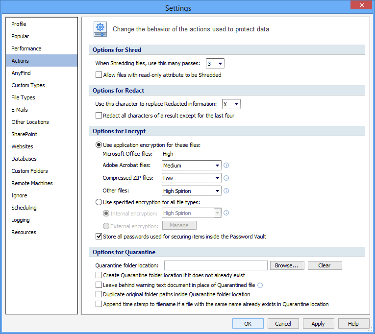 The Actions Settings pages allow you to change the behavior of the actions used to protect data. To open or modify these settings, click the Configuration ribbon, then click the Settings button, then select the Actions page. The following settings are available: