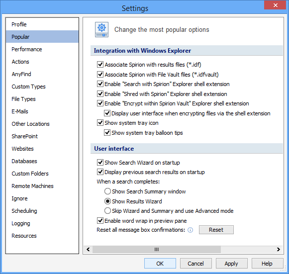 The Popular Settings pages allow you to change the most popular options in Spirion such as integration with Windows Explorer and the user interface. To open or modify these settings, click the Configuration ribbon, then click the Settings button, then select the Popular page. The following settings are available: