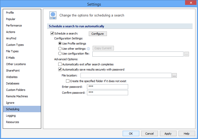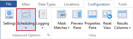 The Scheduling Settings pages allow you to change the options for scheduling a search with Spirion. To open or modify these settings, click the Configuration ribbon, then click the Setting button, then select the Scheduling page. Alternatively you may click the Scheduling button on the Configuration ribbon and select the Customize Schedule option.