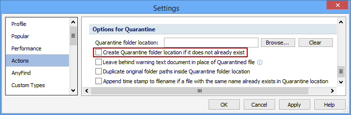 The Create Quarantine Folder Location if it Does Not Already Exist setting allows Spirion to automatically create the folder specified as the Quarantine folder location, if it does not already exist when you quarantine a file.