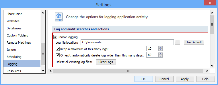 Deletes all contents of the log folder you have specified By default, all logs are kept until they are manually deleted or the Clear Logs button is used |