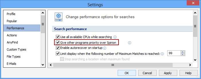 The Give Other Programs Priority Over Spirion setting lowers the priority of Spirion's processes and threads to give precedence to your other Windows applications. Spirion will continue running and will be searching as fast as possible when you are not using your computer, but performance will be slightly slower when you are using other applications. If Spirion is slowing your system performance or your other applications are too slow while Spirion is running, then check this box and click OK. You can change this setting at any time before or during a search.
