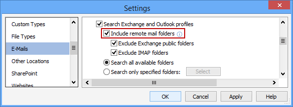The Include Remote Mail Folders setting will enable Spirion to search within all the folders connected via a Microsoft Exchange Mail Server or via IMAP.