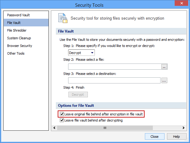 The Leave Original File Behind After Encryption in File Vault tool causes Spirion to leave the original file behind after encrypting it inside an Spirion File Vault. This is useful when you are creating the vault file to share it (for example via email) with someone else, but still want to retain the unencrypted file for viewing/editing purposes. By default, Spirion will shred the original file from disk after it has been encrypted and added to a file vault.