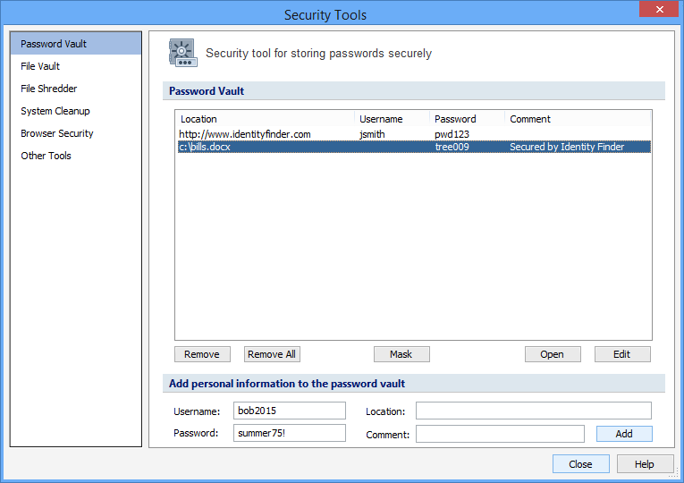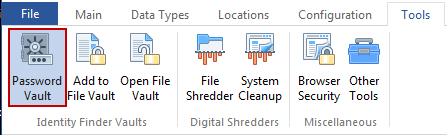The Password Vault tool allows you to securely store and manage usernames and passwords for websites, encrypted files, and other locations inside of Spirion and protect them with a single, master password. The master password is the same password you use to secure other personal information within Spirion. To open the Password Vault tool click the Password Vault button on the Tools ribbon.
