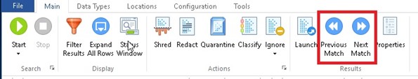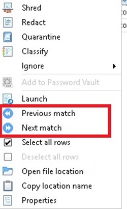 You can use the Previous Match and Next Match buttons on the Main ribbon or by right clicking to seek to Data Matches within the result that you are previewing. You may not use these Previous and Next buttons to seek to another data match, if it is in a different location. To skip to another location, such as a file or email message, you can use the arrow keys or your mouse.
