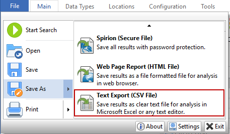 Saving results as a Text Export file generates a *.csv file that is plain text and not encrypted. Files saved in this format must be kept secure. These can easily be opened in Excel or another spreadsheet or database program but cannot be opened in Spirion. To save your results in this format, click the Save As icon in the File ribbon. Once you choose Save As, the Save As dialog box will open. You may select the folder location and filename for your results. You will see the Options button on the bottom right of this dialog. Clicking the Options button will open the Text Export Save Options dialog box that allows you to choose what to include in your saved file and allows you to omit information depending on what type of file you are saving. The following save options are available: