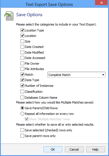 - Please select the categories to include your Text Export: The checkboxes under this heading correspond to each of the columns in the Results View and allows you to select which information will be included in the saved file. For the Data Match itself, you can choose to save the Complete Match, the Last four characters only of the match, or the Last four characters of each match except for Credit Card Numbers which will save the first six and last four. Any characters that are not saved will be included in the saved file as an asterisk (*).