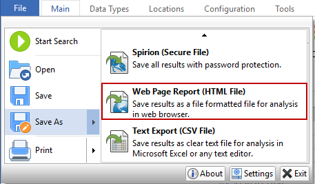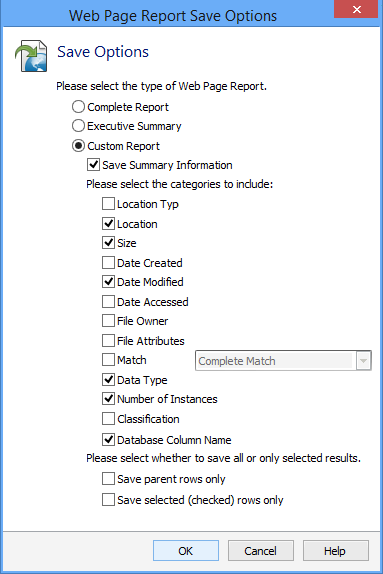 Saving results as a Web Page Report file generates a *.html file that is plain text and not encrypted. Files saved in this format must be kept secure. To save your results in this format, click the Save As icon in the File ribbon. You cannot open these files back up in Spirion. Once you choose Save As, the Save As dialog box will open. You may select the folder location and filename for your results. You will see the Options button on the bottom right of this dialog. Clicking the Options button will open the Web Page Report Save Options dialog box that allows you to choose what to include in your saved file and allows you to omit information depending on what type of file you are saving. The following save options are available: