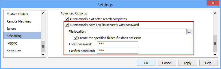 The Automatically Save Results Securely with Password setting allows Spirion to automatically and securely save an Spirion results file to the location of your choice with the password of your choice.