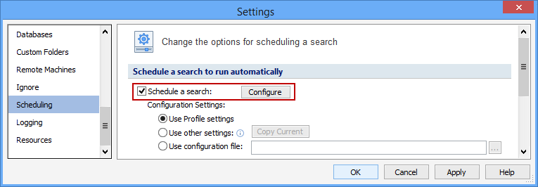 To view or modify this setting, click the Configuration ribbon, then the Settings button and then select the Scheduling page. For additional settings please refer to Change the Options for Scheduling a Search or Settings to Customize Your Experience.