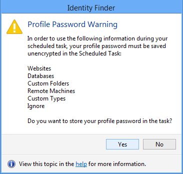 - After providing your Windows username, you may be prompted with the following dialog, "In order to use the following information during your scheduled task, your profile password must be saved unencrypted in the Scheduled Task." In order for Spirion to automatically read the encrypted portions of your profile, it is necessary for the Windows task to store your password. If you do not need the search to include any of this information, click No.