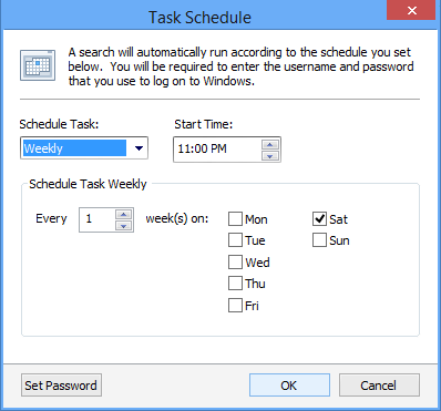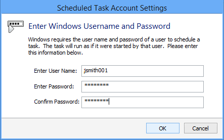 Note: When you schedule a task in Windows, it requires your user name and password to allow that program to run as you. Spirion does not store your username and password, rather it simply passes them to the Windows system. When you click OK or, if you click Set Password, you see the Scheduled Task Account Settings dialog box.