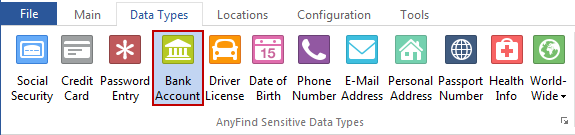 You can enable or disable AnyFind searching for Bank Account Numbers by clicking the Bank Account button on the Data Types ribbon. When the button is highlighted, Spirion will search for Bank Account Numbers using AnyFind.