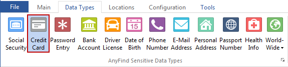 You can enable or disable AnyFind searching for Credit Card Numbers by clicking the Credit Card button on the Data Types ribbon. When the button is highlighted, Spirion will search for Credit Card Numbers using AnyFind.