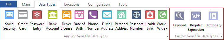 To view or modify Custom Type settings, click the Configuration ribbon, then the Settings button, then the Custom Type page. Alternatively you may click the Data Types ribbon, then click the Custom Sensitive Data Types option button. For additional information on Custom Types please refer to Searching with Custom Types and Regular Expressions.