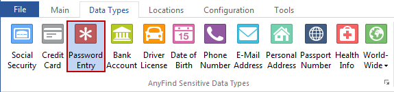 You can enable or disable AnyFind searching for Passwords by clicking the Password Values button on the Data Types ribbon. When the button is highlighted, Spirion will search for Passwords using AnyFind.