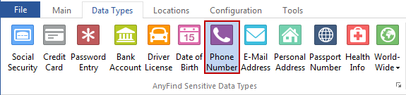 You can enable or disable AnyFind searching for Phone Numbers by clicking the Phone Number button on the Data Types ribbon. When the button is highlighted, Spirion will search for Phone Numbers using AnyFind.