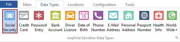 You can enable or disable AnyFind searching for Social Security Numbers by clicking the Social Security button on the Data Types ribbon. When the button is highlighted, Spirion will search for Social Security Numbers using AnyFind.