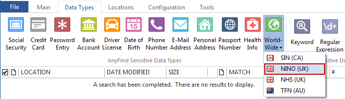 You can enable or disable AnyFind searching for United Kingdom National Insurance Numbers by clicking on the Data Types ribbon, then click the dropdown menu for Worldwide and select NINO (UK) AnyFind. When the button is highlighted, Spirion will search for United Kingdom National Insurance Numbers using AnyFind.