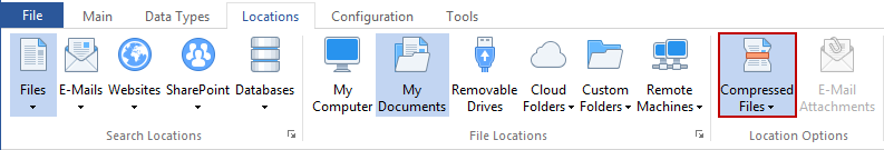 You can enable searching of Compressed Files by clicking the Compressed Files button on the Locations ribbon. Compressed files are archives that contain additional files. When enabled, the button will be highlighted and Spirion searches for compressed files in the File Location you specify.