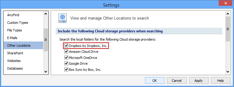 The Dropbox by Dropbox, Inc. setting will enable Spirion to automatically determine the local storage location for folders synchronized with Dropbox cloud storage. When File Locations is set to Cloud Folders, the agent will locate and search only the specified cloud folder storage locations. The user on the machine must be signed into Dropbox in order for the locally synced cloud folder to be searched.