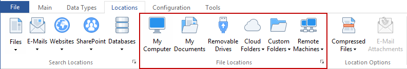 Note: You cannot select multiple buttons in the File Locations group. If you want to search multiple disparate locations, simply use the Custom Folders button.