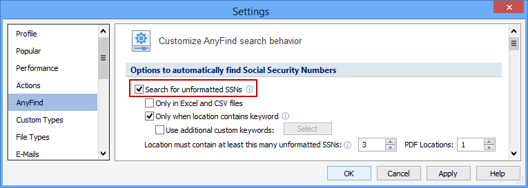 The Search for Unformatted SSNs setting allows Spirion to search for unformatted SSNs when you search for Social Security Numbers. Unformatted Social Security Numbers (SSNs) are numbers in locations without dashes or spaces or other characters. For example, 123456789 could be an unformatted SSN. If this setting is enabled, you can specify when to search for unformatted SSNs to reduce false positives. If this setting is disabled Spirion will rarely find unformatted SSNs and uses internal logic to only find them when there is a high probability, they are accurate.