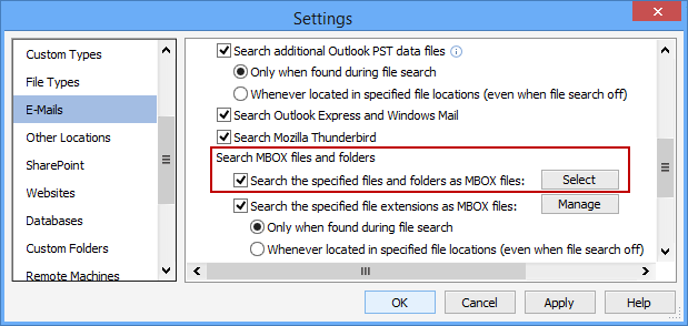The Search the Specified Files and Folders as MBOX Files setting will enable Spirion to search for personal information within the specified MBOX files and folders. You can select specific files or all files within specific folders by pressing the Select button.
