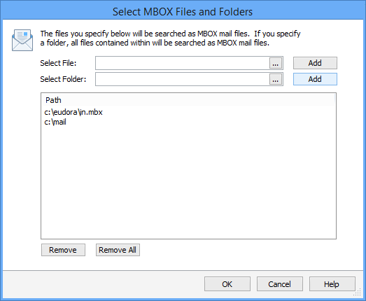 The Select MBOX Files and Folders dialog will appear. You can enter a specific file in the Select File field or you can enter a specific folder in the Select Folder field then click the Add button. If you specify a folder, Spirion will attempt to search all files in that folder and its subfolders as if they were MBOX formatted mail files.