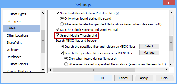 The Search Mozilla Thunderbird setting will enable Spirion to search for personal information within your local Thunderbird profiles and folders.