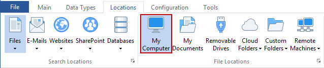 The My Computer button specifies that Spirion will search all drives (removable and local) on your computer. If this option is selected, the My Computer button on the Locations ribbon will be highlighted. If you require the ability to search Network Drives, you can turn this feature on using the Include Mapped Network Drives When Searching My Computers setting located here: Configuration/Settings/File Types.
