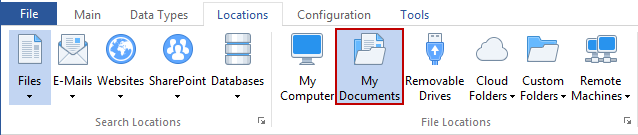 The My Documents button specifies that Spirion will search the currently logged in user's My Documents directory. These folders are typically located at C:\Users\USERNAME in Windows Vista and later; however if they are not located in their default location, Spirion will automatically detect this and search the correct locations. If this option is selected, the My Documents button on the Locations ribbon will be highlighted.