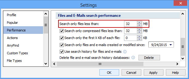 The Search Only Files Less Than setting prevents Spirion from searching any files that are greater in size than the number of megabytes (MB) specified. This feature enables you to increase the speed and performance of Spirion's search and is especially useful when searching folders containing large documents that contain only images. This setting will also apply to files that are inside compressed files or attached to emails.