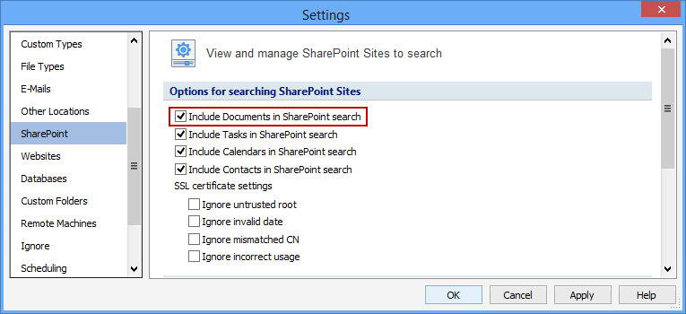 The Include Documents in SharePoint search setting allows Spirion to search SharePoint sites for documents such as aspx, pdf, pptx, docx, etc.