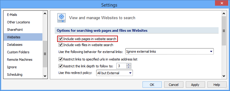 The Include Web Pages in Website Search setting allows Spirion to search website pages such as htm, html, asp, aspx, etc. If you also want to search website files (like PDF and DOC files), refer to Searching Web Files for Confidential Data.